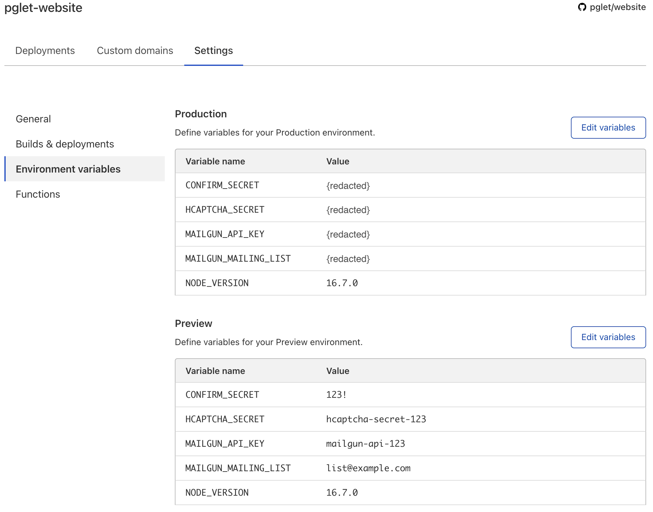 For your Cloudflare Pages website, you can configure Production and Preview environment variables on Settings โ Environment variables page: